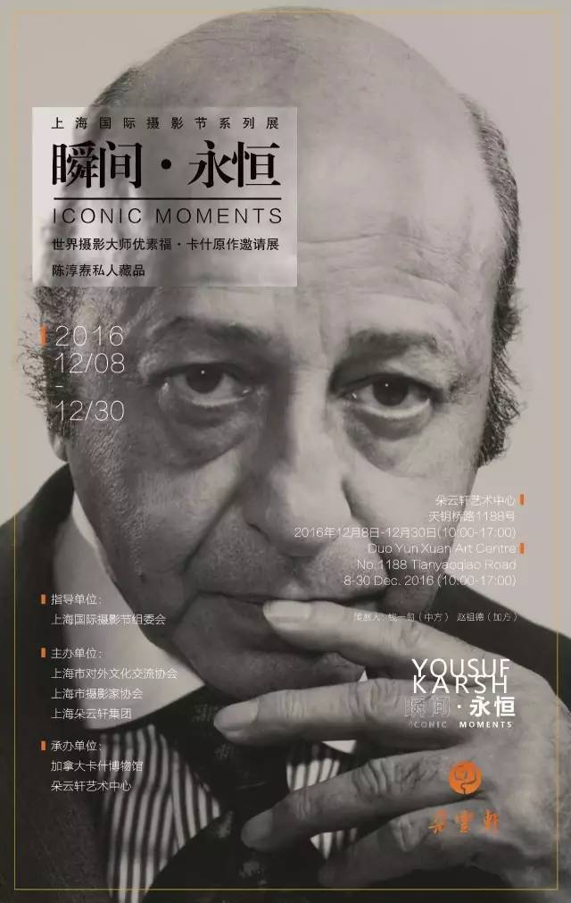 2016年12月8日,《“瞬间 · 永恒” 世界人像大师优素福·卡什原作摄影展》在上海市朵云轩艺术中心美术馆开展。155幅卡什的原作为观者提供了亲近人物内心不为人知晓的心境与情绪的可能。同时,此次展览所特别设定的女性作品区,也为观众提供了另一种镜像的优素福•卡什。这批展品全部来自于全球卡什人像摄影原作最大的收藏家陈淳焘(Shelton Chen)的个人收藏。