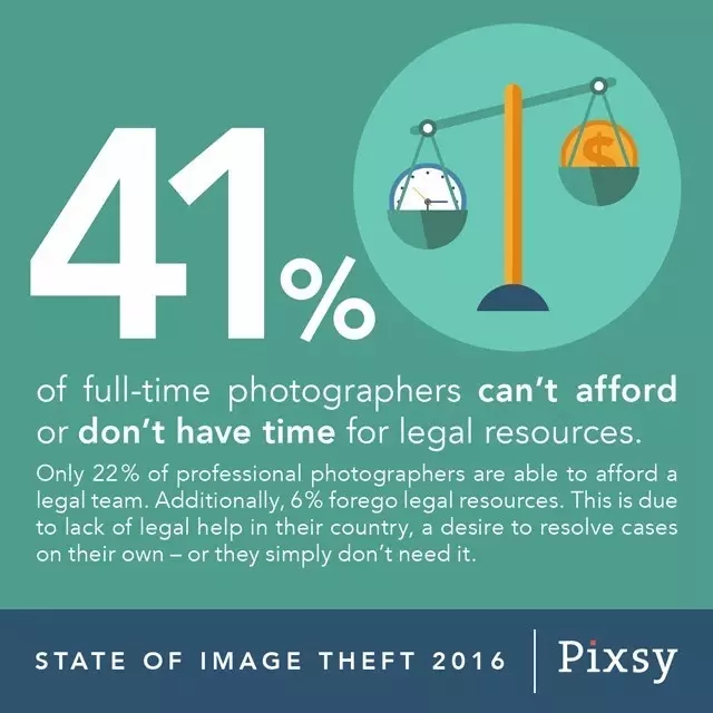 3、许多摄影师选择不追究盗图者责任,这并不奇怪,因为有41%摄影师负担不起或者没有时间寻求法律解决。