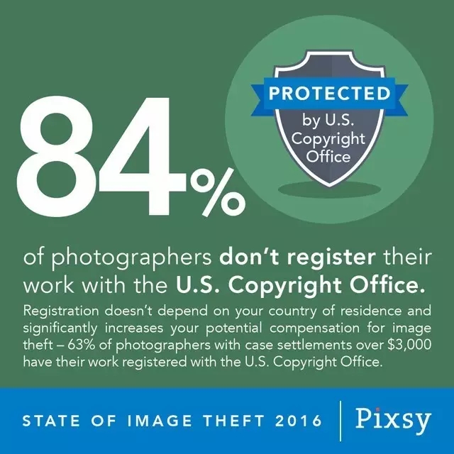 4、84%的摄影师没有在美国版权局注册他们的作品。不过,版权注册将会将大幅提高你的照片被盗用的潜在赔偿金额,在哪些已经注册过版权的摄影师中,63%的侵权赔偿都超过了3000美元。