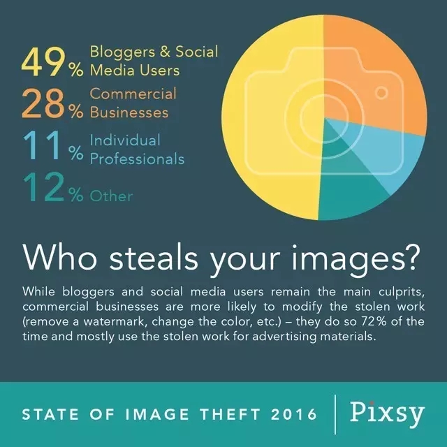 Pixsy共对800名受访者的进行了调查,调查结果对摄影师了解其作品被盗情况以及如何采取版权保护提供了有益的参考。统计数据显示:在过去一年里,64%的摄影师经历过图片盗用;50%的盗用者是博主和社交媒体用户;84%的摄影师从未向美国版权局注册过作品。